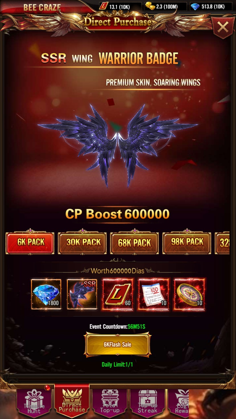 Daily Continuous Recharge: Recharge daily to receive many valuable rewards. Additionally, you can purchase the 98k pack to get rare items through the Warriors Badge completed quest.