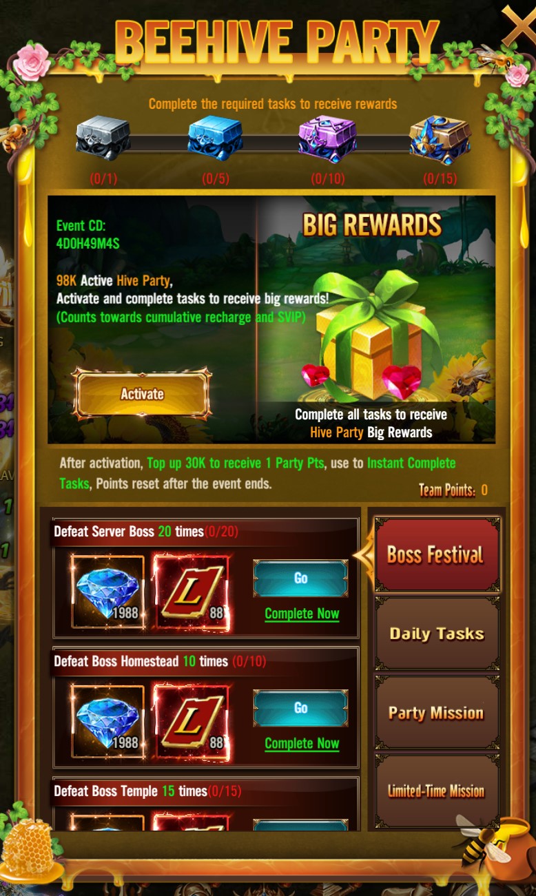 Complete Tasks: Complete event tasks to receive diamonds and LV vouchers. Additionally, you can activate special event rewards to receive extremely valuable items, especially the Red Equipment Chest.